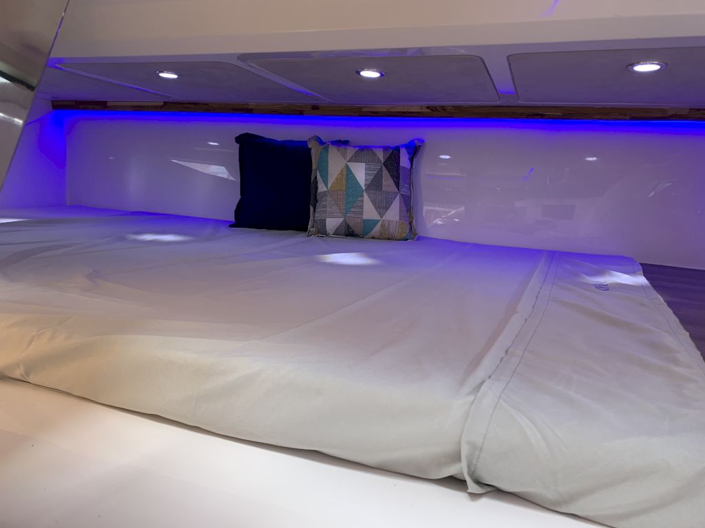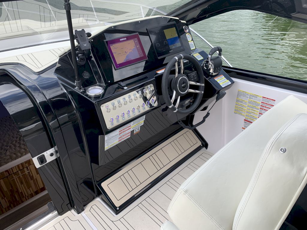 O Modelo conta com uma proa aberta, cabine com cama de proa e meia nau, cockpit amplo e espaçoso para uma excelente interação entre os passageiros, nichos para armazenamento de equipamentos, mantimentos e bebidas, plataforma de popa com Double Open Deck e um espaço gourmet de série.